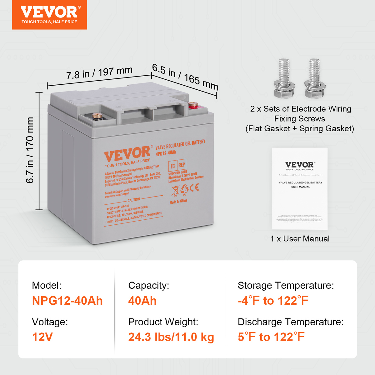 Heavy-Duty Rechargeable Battery: The VEVOR 12V 40Ah rechargeable deep cycle battery, with dimensions of 7.8'' x 6.5'' x 6.7'', stores a substantial amount of energy, extending the runtime of most light-duty electric devices. Note: Professional charging equipment is required during use to ensure battery security.