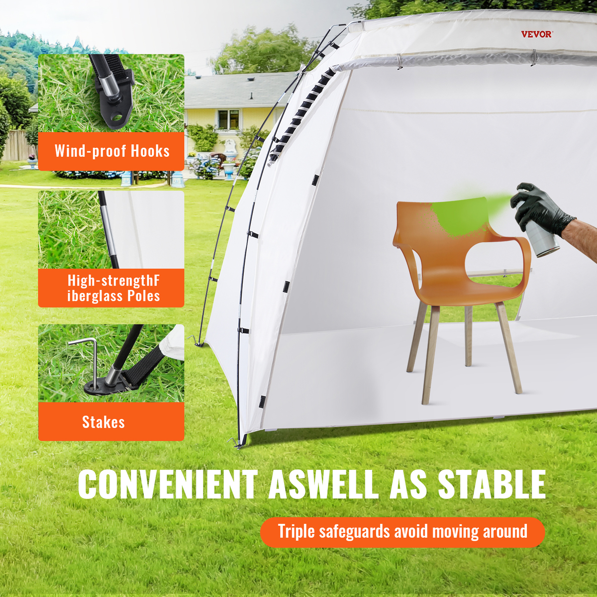 Firm Construction: Coming with sturdy stakes and ropes, our paint spray tent can be solidly secured to the ground, such as garage, driveway, lawn, or even indoors.