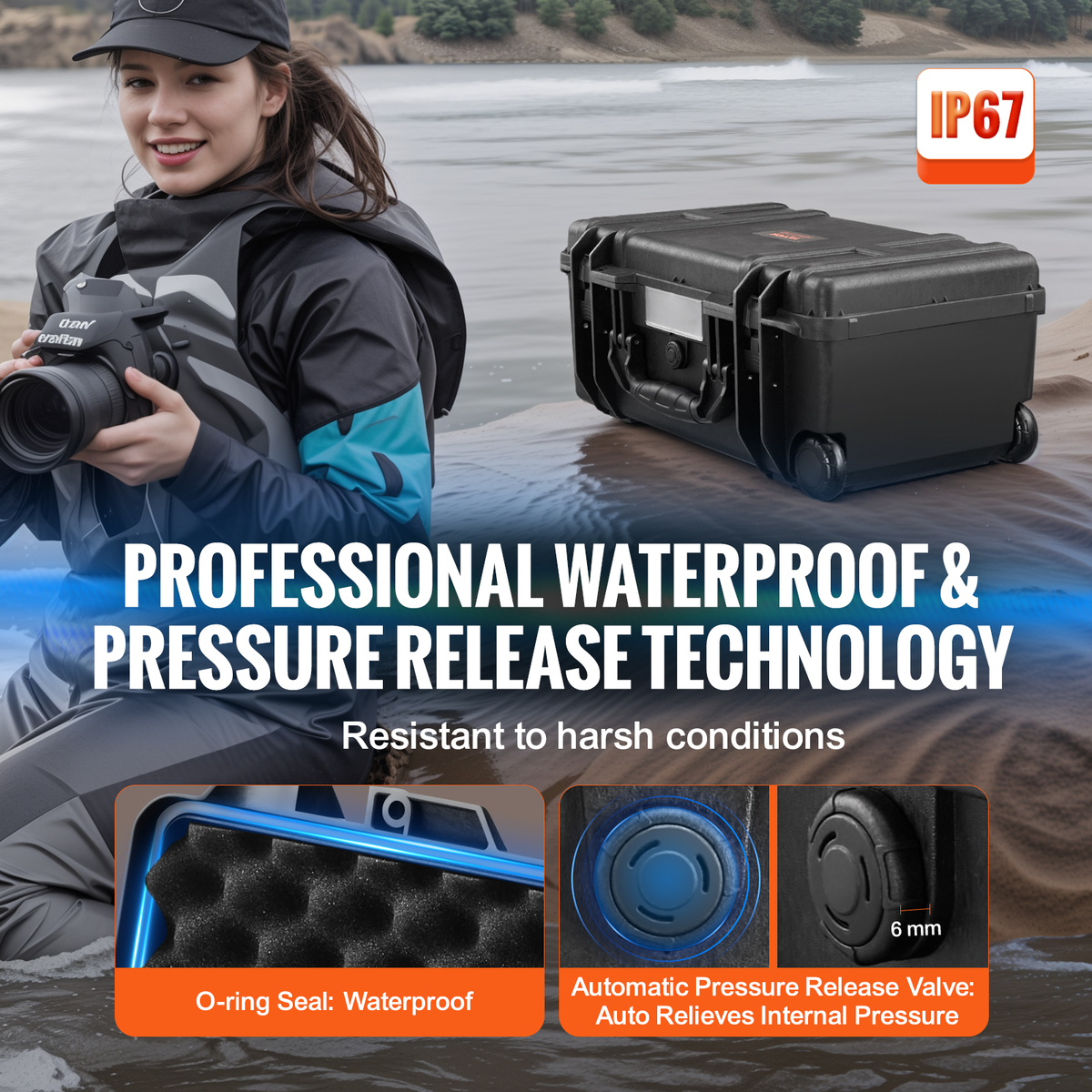 IPX67 Test Report: Vevor waterproof hard case have passed international IPX67 test report?The O-ring seals and automatic pressure equalization valve design ensure your items stay safe even in water, allowing you to enjoy water activities worry-free.