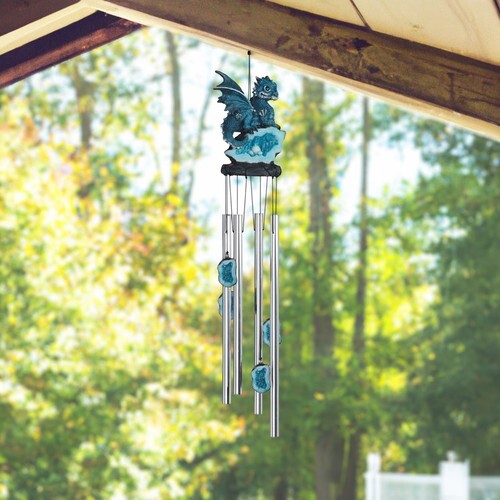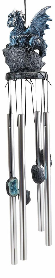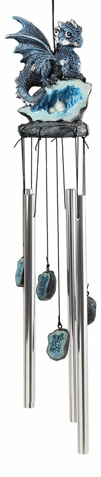? A blue aquamarine metallic guardian dragon perches on top of a geode crystal rock of immeasurable power and magic. Connected to the sculptural crown of the wind chime are aluminum rods and ornamental sculptures of miniature geode rocks. The wind chime is a perfect gift for your loved ones who love dungeons and dragons, myths and magic, gothic alchemy themed decors.