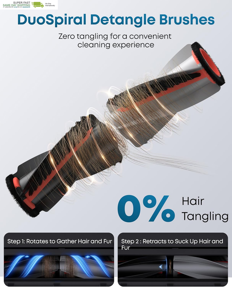 DuoSpiral Anti-Tangle Brushes for Enhanced Pet Hair Management: Designed to prevent hair and fur from tangling, reducing clogs and minimizing manual cleanup?perfect for households with pets.