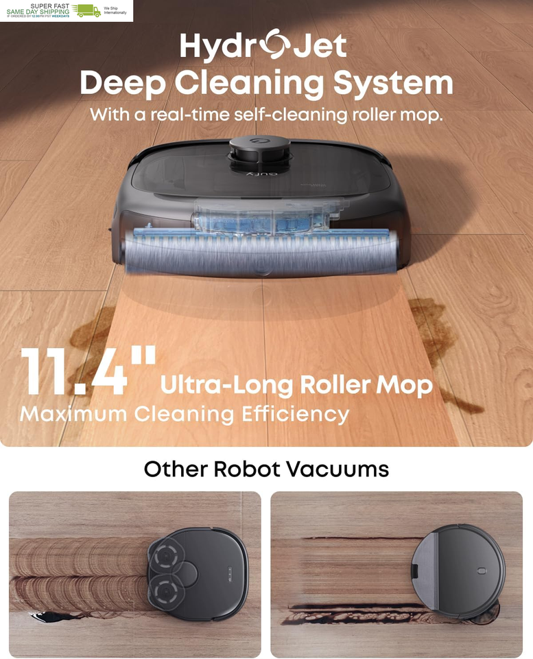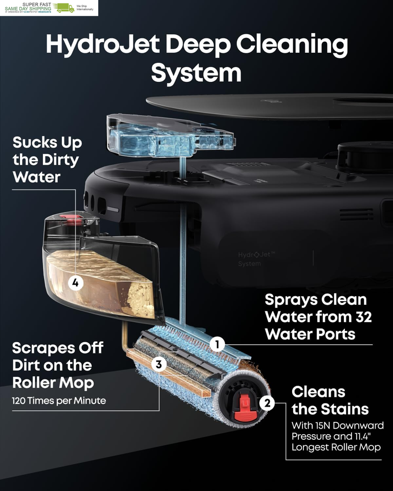 HydroJet System with Self-Washing Roller Mops: Our intelligent robot mops feature real-time self-cleaning that refreshes the rollers 6 times per second, ensuring a consistently spotless clean for whole-home cleaning without interruptions.