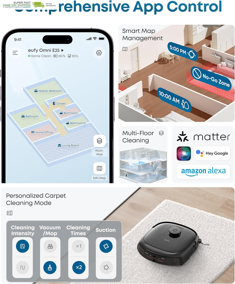 1 Smart App Control 2 Matter Protocol Supported 3 Smart Voice Control 4 Multi-level Mapping 5 Customized Cleaning