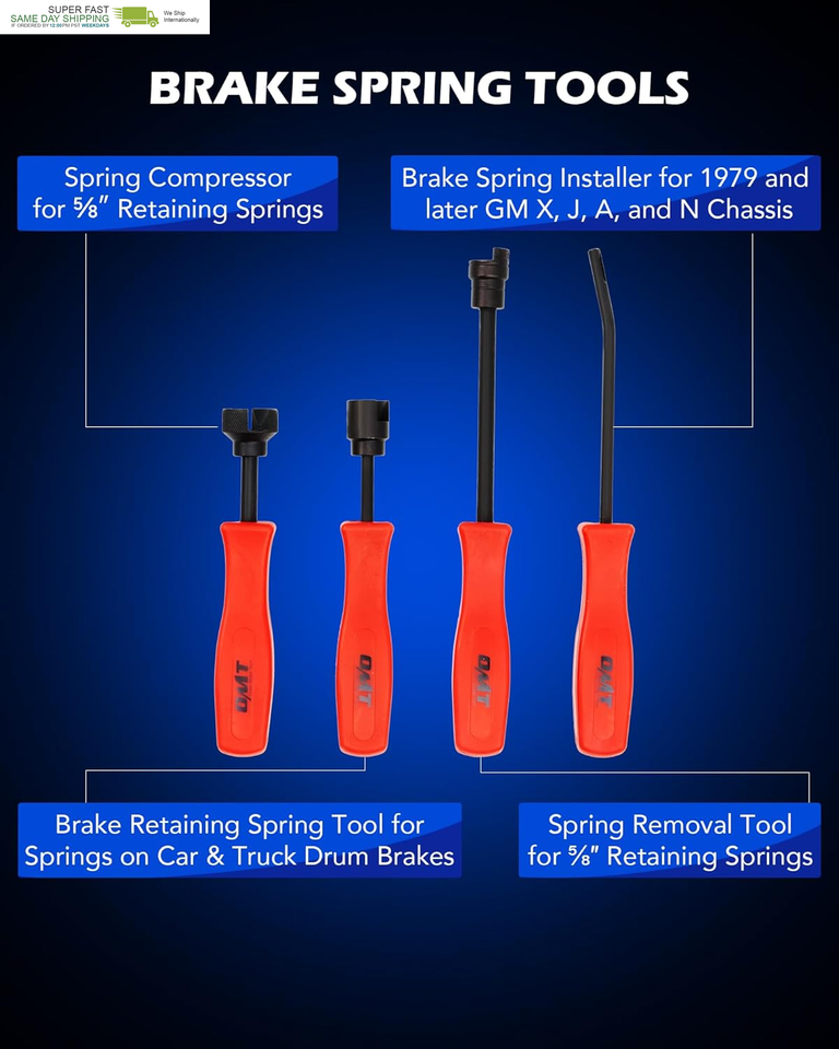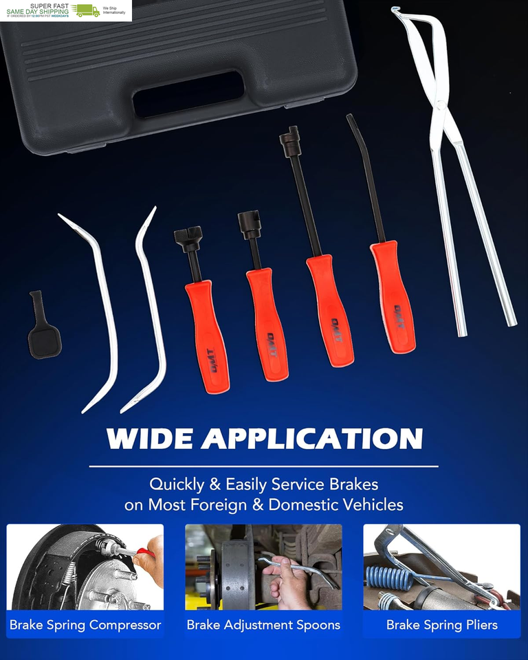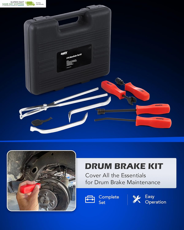 This professional brake service tool kit includes all the essential tools you need to let you easily replace worn springs, check brake pads, and inspect other parts of your drum brake system.