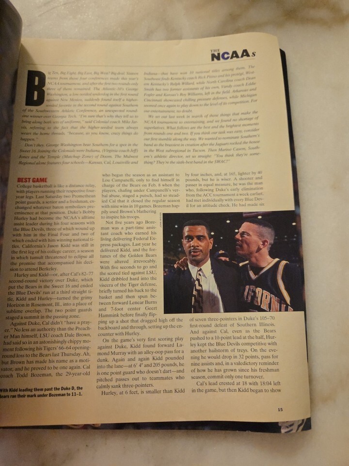 This product is a lot of two vintage Sports Illustrated magazines from March 29, 1993, featuring basketball player Jason Kidd during his college days at NCAA Cal Duke College. The magazines capture a piece of basketball history with articles, photos, and insights into Kidd's early career and achievements. Perfect for collectors or fans of vintage sports memorabilia, these magazines offer a unique glimpse into the world of basketball in the early 1990s through the perspective of a rising star like Jason Kidd.