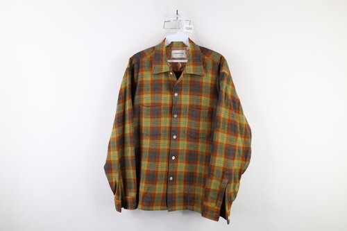 This vintage Pilgrim button-up shirt from the 50s features a classic plaid pattern in multicolor flannel fabric, with a collared neckline and button-down collar style. It has long sleeves with button accents and a regular fit in size L (42/44). Made in the United States, this retro shirt exudes a 50s theme and is a stylish addition to any men's wardrobe.