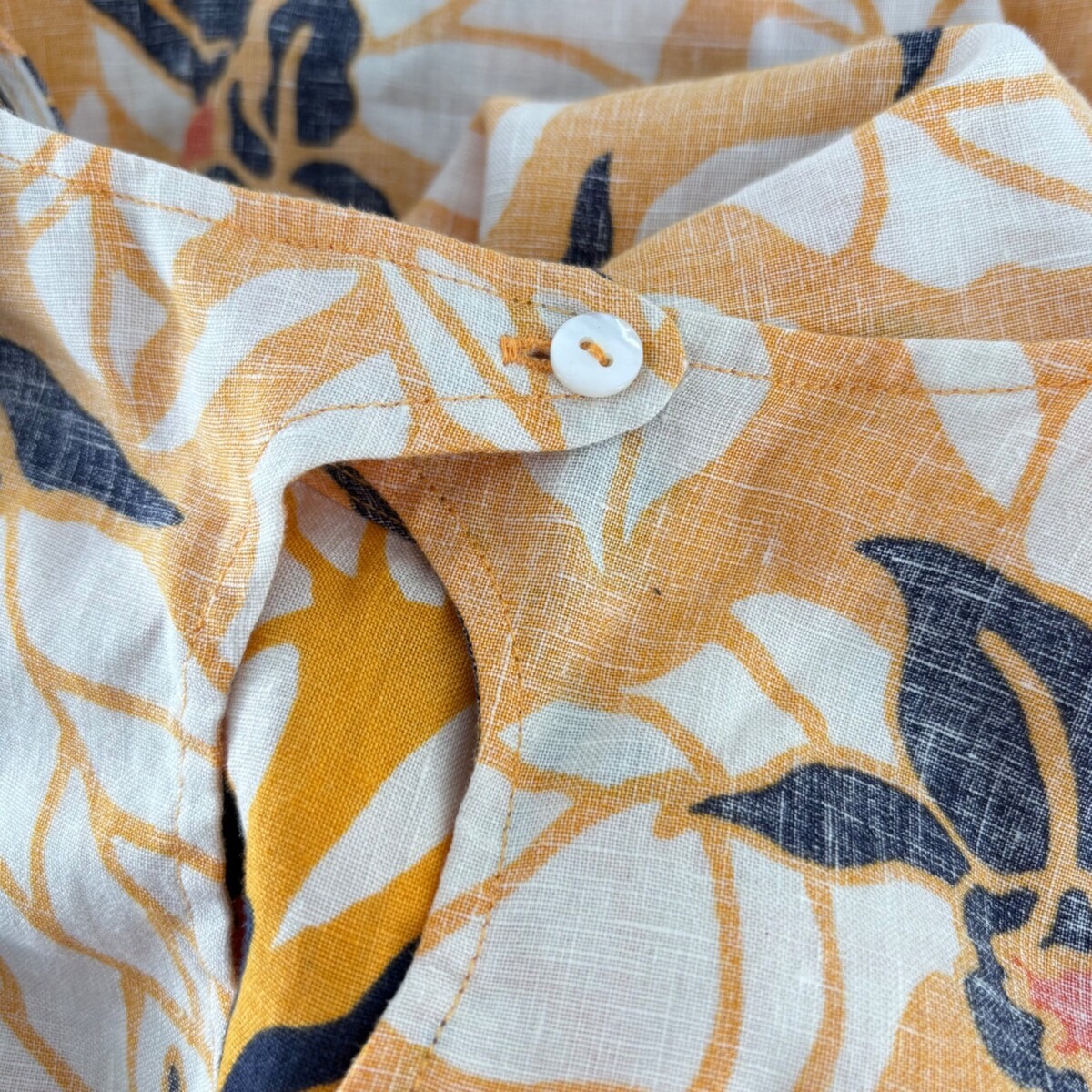 Summery, reverse-print linen shift features exotic floral design and a keyhole button closure in the back.