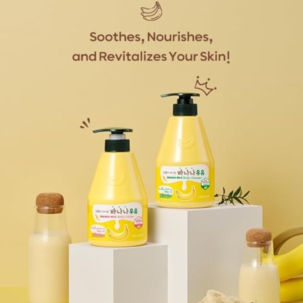 The KWAILNARA Milk Body Lotion in Banana Milk scent, 560 g / 19.75 oz., offers rich hydration with a sweet, comforting banana fragrance that lingers softly on the skin. Its creamy formula absorbs quickly, leaving your skin feeling soft, smooth, and deeply moisturized without any greasy residue. Ideal for daily use, this lotion is perfect for anyone seeking long-lasting hydration with a delightful, fruity aroma