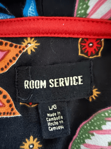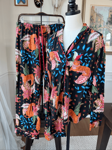 Room service two piece long pajama set featuring long sleeve button in front top and bottoms with elastic and drawstring waist. Featuring a bold and colorful all over tiger print with foliage and bandanna print. Tag size large. Shawl collar. Laying flat the top measures 26 inches shoulder to him And 22 inches armpit to armpit. The bottoms measure 14.5 inches straight across the waist stretching to 20 inches without much resistance and a 30 inch inseam. Polyester and spandex blend bold and colorful in black, blue, orange, green, pink, yellow, and probably a little more. Spare button on the inside tag.