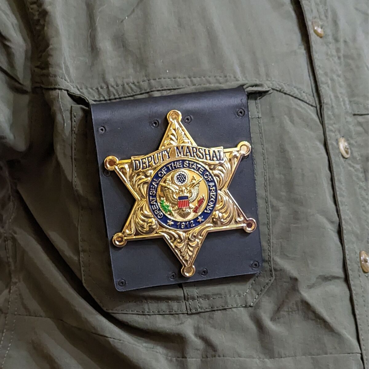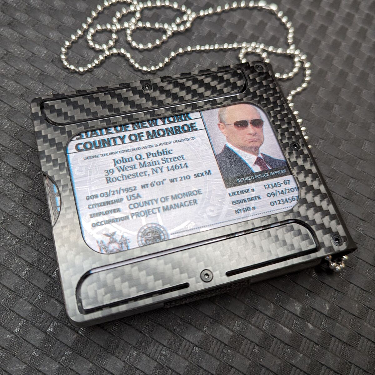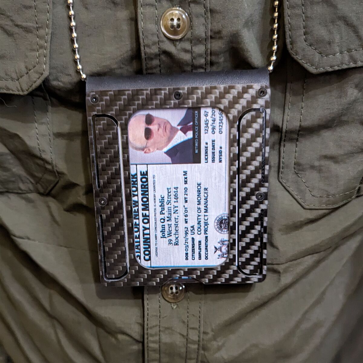Leather and Carbon fiber police badge holder with ID card slot on reverse.