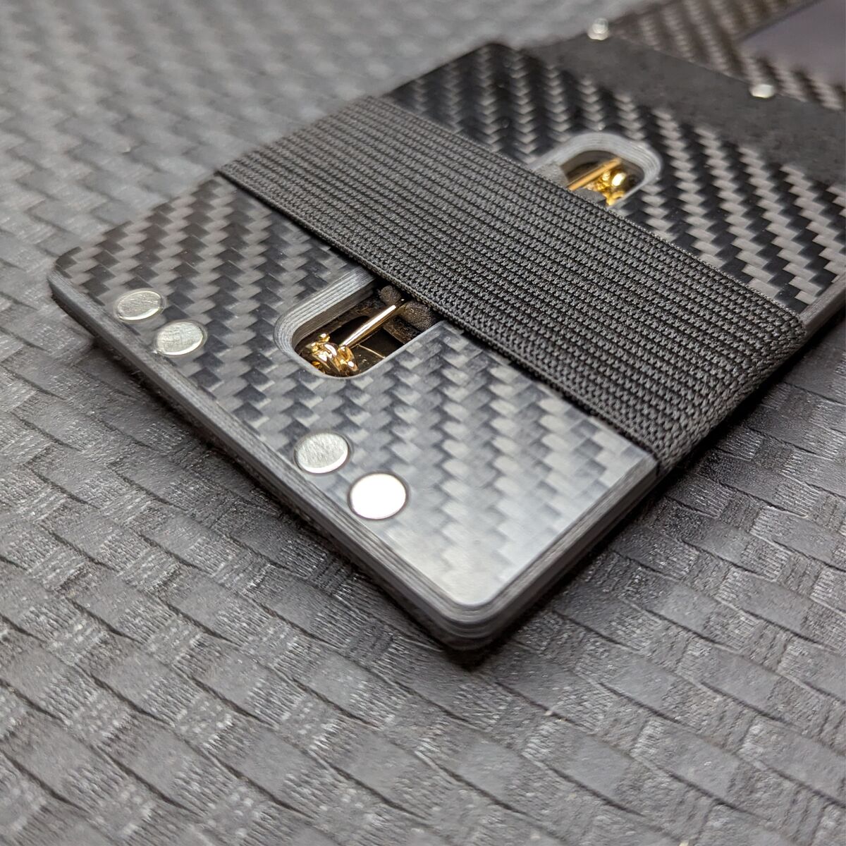 Genuine leather front and carbon fiber card holder on the back for up to 3 cards