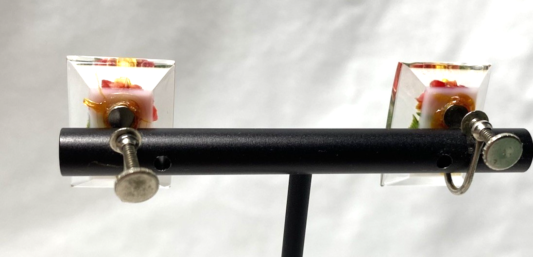 Clear Resin Rectangle with Red Flower Screw Back - .75" x .5"