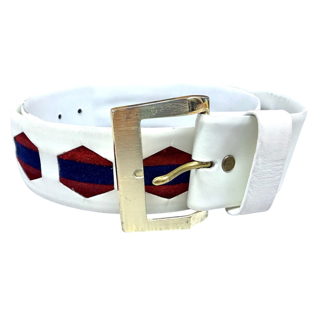 VTG 70s White Steerhide Leather Belt w/ Red & Navy Velvet Inlay Brass Buckle 38