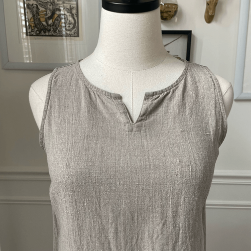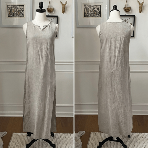 Fog Linen Work 100% linen flax or natural color maxi dress. Sleeveless with notched neck and vents at each side for easy movement. 18 inches armpit to armpit, 18 inches straight across the waist and 48 inches shoulder to hem with 9 inch vents up from the hem on each side. Retail $248. Linen is perfect for staying cool in outrageously hot weather and the style is very coastal grandmother login look beach Hamptons based on the measurements. I estimate this to be approximately size small however there is no size tag so please use the measurements as your guide. The arm holes are cut high enough where you don?t have to wear a shirt underneath or layer with a T-shirt.