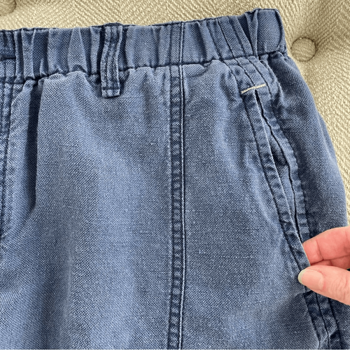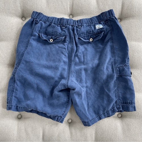 Tommy Bahama relax blue linen and tencel cargo shorts with button and zip closure, elastic and drawstring waist. Measures approximately 16 inches straight across the waist with a 9 inch inseam. Spare buttons on the interior tag. Logo above the back pocket.