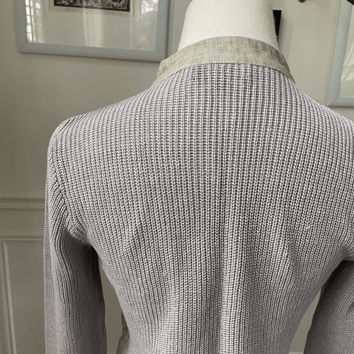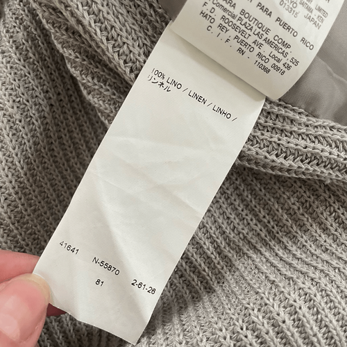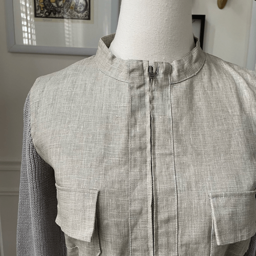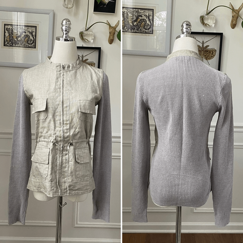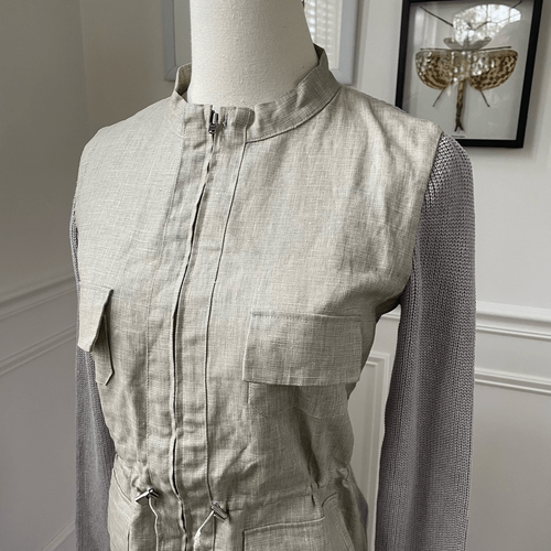 Adolfo Dominguez 100% linen mixed material safari jacket with band collar, two flap chest pockets, two flap hip pockets and adjustable toggle waist. The mixed material is 100% linen flax color torso in the front with ribbed sweater, knit sleeves, and back made out of 100% linen yarn. Laying flat measures 23 inches shoulder to hem and 16.5 inches armpit to armpit zipped shut. Tag size P, which is roughly equivalent to a US extra small. I have listed it as an extra small since P is not an option, but please double check measurements to ensure the proper fit for you.