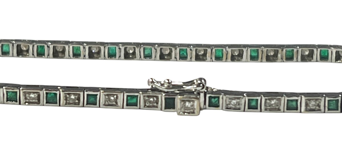Type: BraceletWeight: 5.7Karat: 18ktMetal: White GoldGender: Women'sStyle: FancySize / Length: 7"Owner applied: a 750Stone 1 quantity: 29Stone 1 shape: RoundStone 1 color: ClearStone 1 weight (total): .60Stone 1 type: DiamondStone 2 Quantity: 40Stone 2 Shape: PrincessStone 2 Color: GreenStone 2 Weight (Total): .80Condition:Used