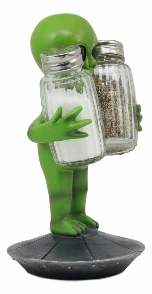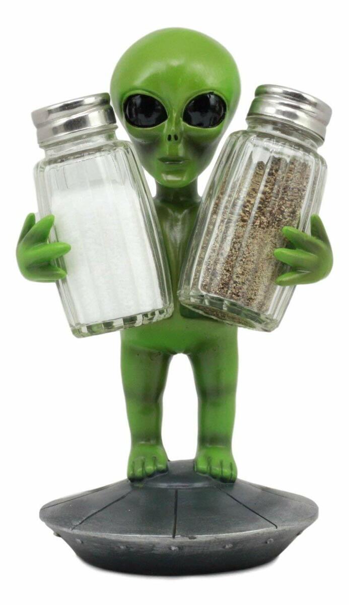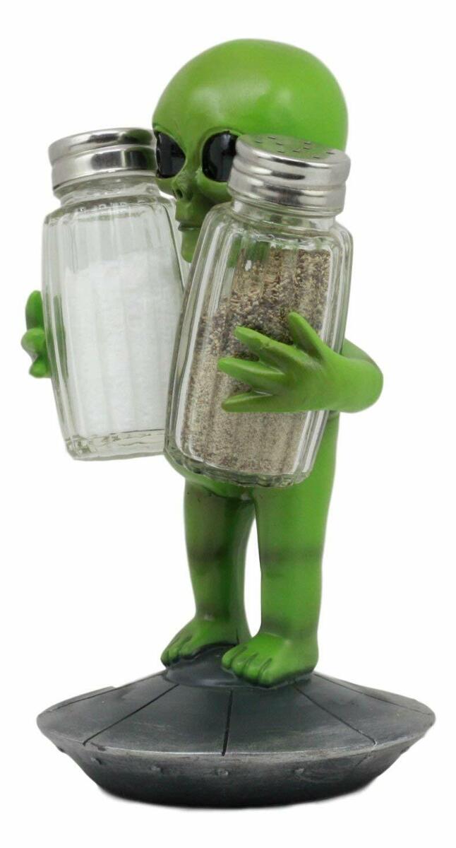 ? Beep Beep Beep! Make way for this Roswell Alien pawn that has just landed on earth! He has found two essential elements necessary of Alien Sustenance on earth; Salt And Pepper! He stands on top of a space UFO dish ship while hugging two glass shakers for your spices. He will make a perfect conversation piece and ice breaker over dinner!