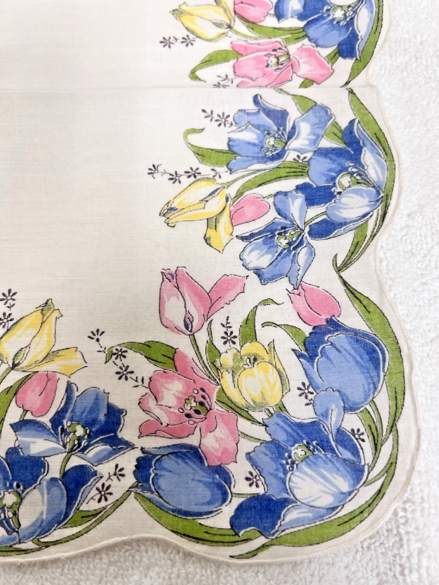 Vintage Pink Blue Yellow Floral Tulip Cotton Handkerchief Scalloped Edge 12"