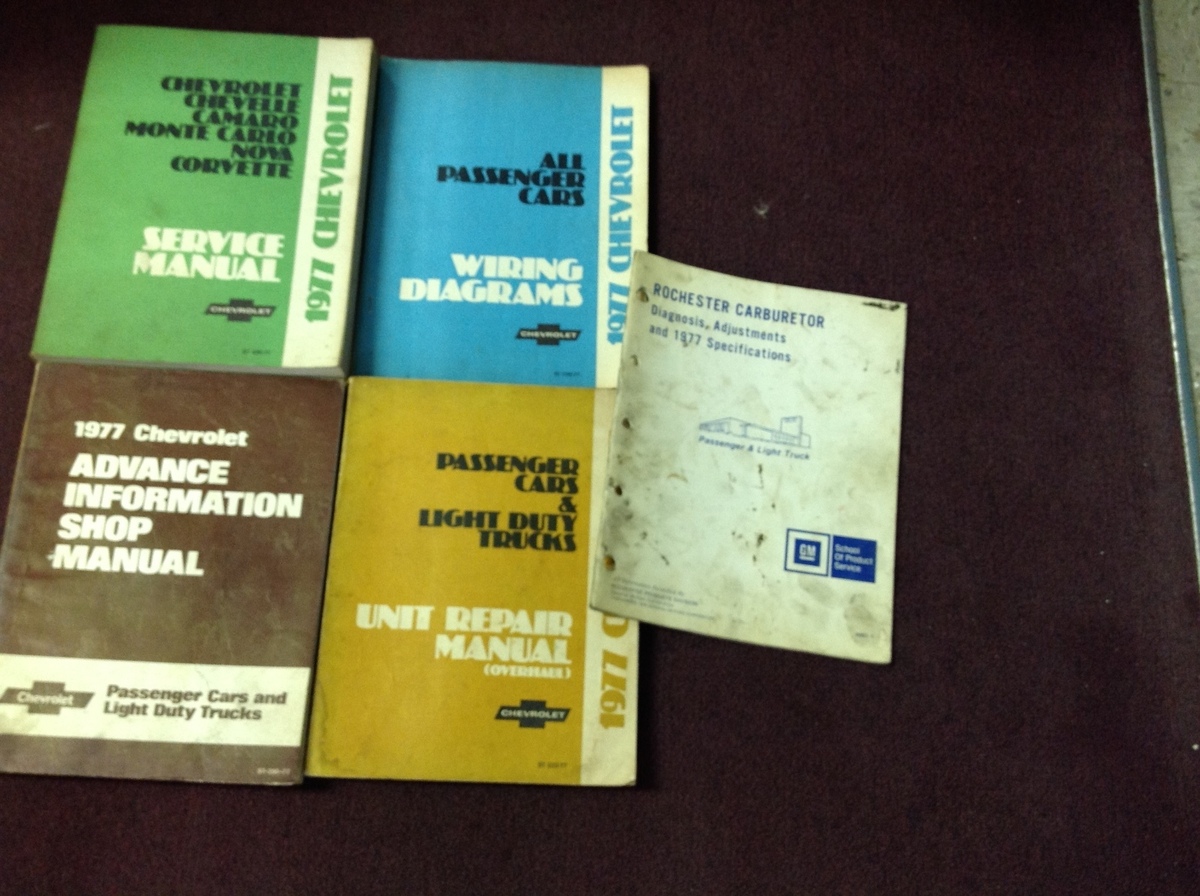 1977 Factory Chevrolet Camaro/Chevelle/Nova/Monte Carlo Service Manual,Unit Repair Manual, Wiring Diagrams Manual, Rochester Carburetor Manual, and the Advance Information Shop Manual