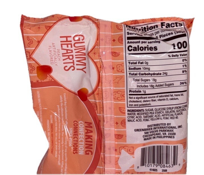 The product is a 7oz bag of gummy hearts in a peach flavor, perfect for Valentine's Day or any time of year. Made by Coastal Bay Confections, these fat-free candies are filled with love and sweetness. Each serving size is 5 pieces, with a total of 7 servings per bag. Whether for a special occasion or just to treat yourself, these delightful gummy hearts are sure to satisfy your sweet tooth.