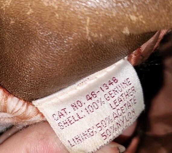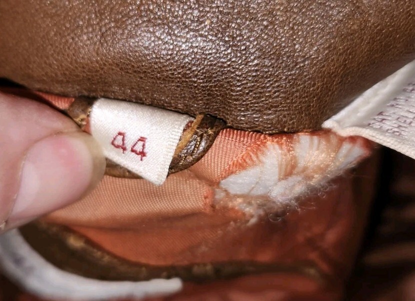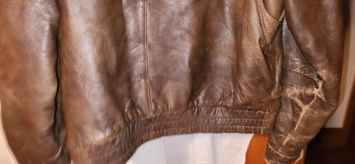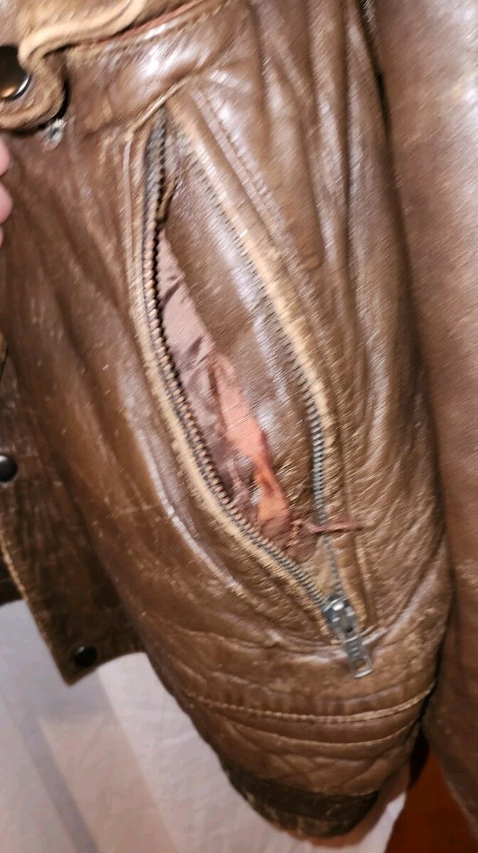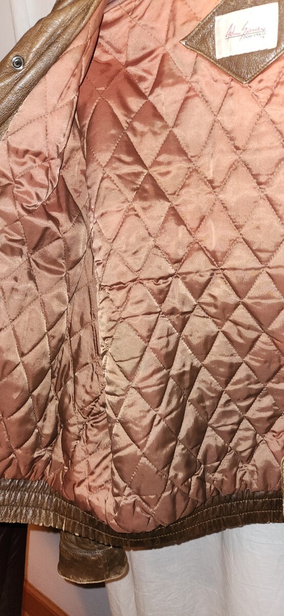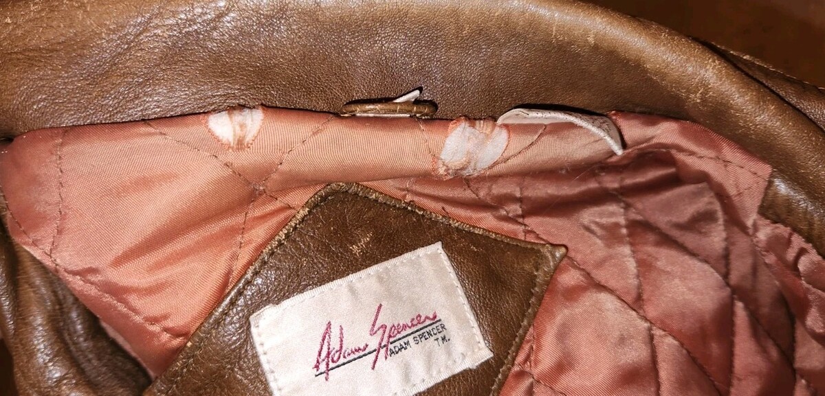 This jacket is a well loved and distressed Adam Spencer size 44. Has wear from age and use. Zipper functions but it does have some issues starting at the bottom. Snags a little the first few inches. Has holes in the lining of the pockets. Few holes at the collar. Lined .