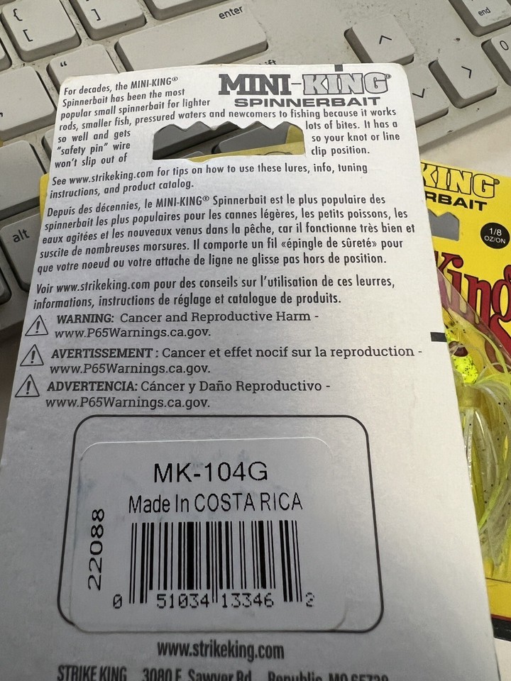 This Mini-King Spinnerbait has a single Colorado 1/8oz mini blade and comes in two models, MK-104G and MK-71. It is manufactured in Costa Rica and comes with a California Prop 65 warning. Don't miss this opportunity to add this amazing Spinnerbait to your fishing collection.