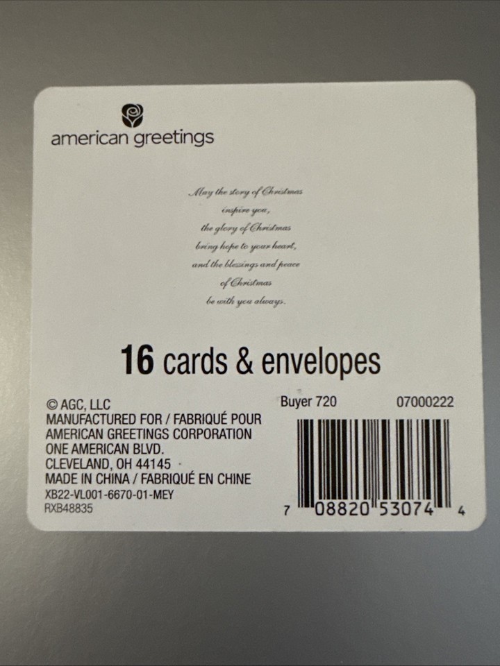 The American Greetings Christmas Cards and Envelopes 16 Count is a collection of festive and heartfelt cards perfect for sending holiday greetings. With a variety of designs and messages, these cards are ideal for spreading Christmas cheer to friends, family, and loved ones. The included envelopes make it easy to send these cards with a personalized touch, making it a convenient and thoughtful way to celebrate the season.