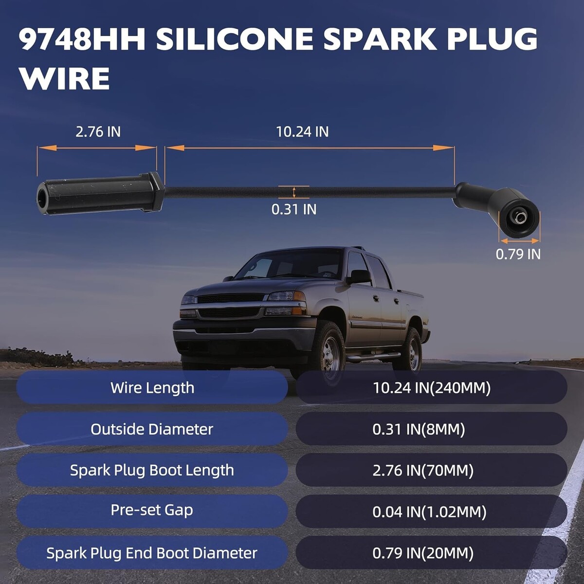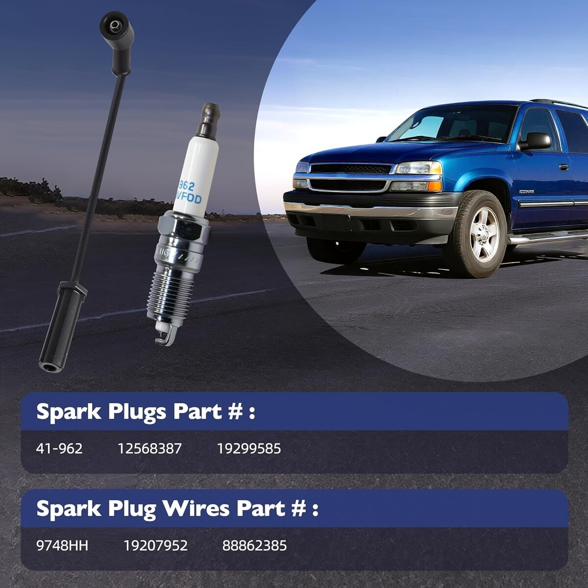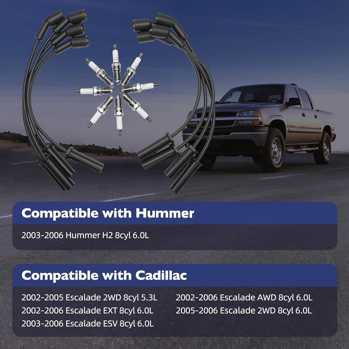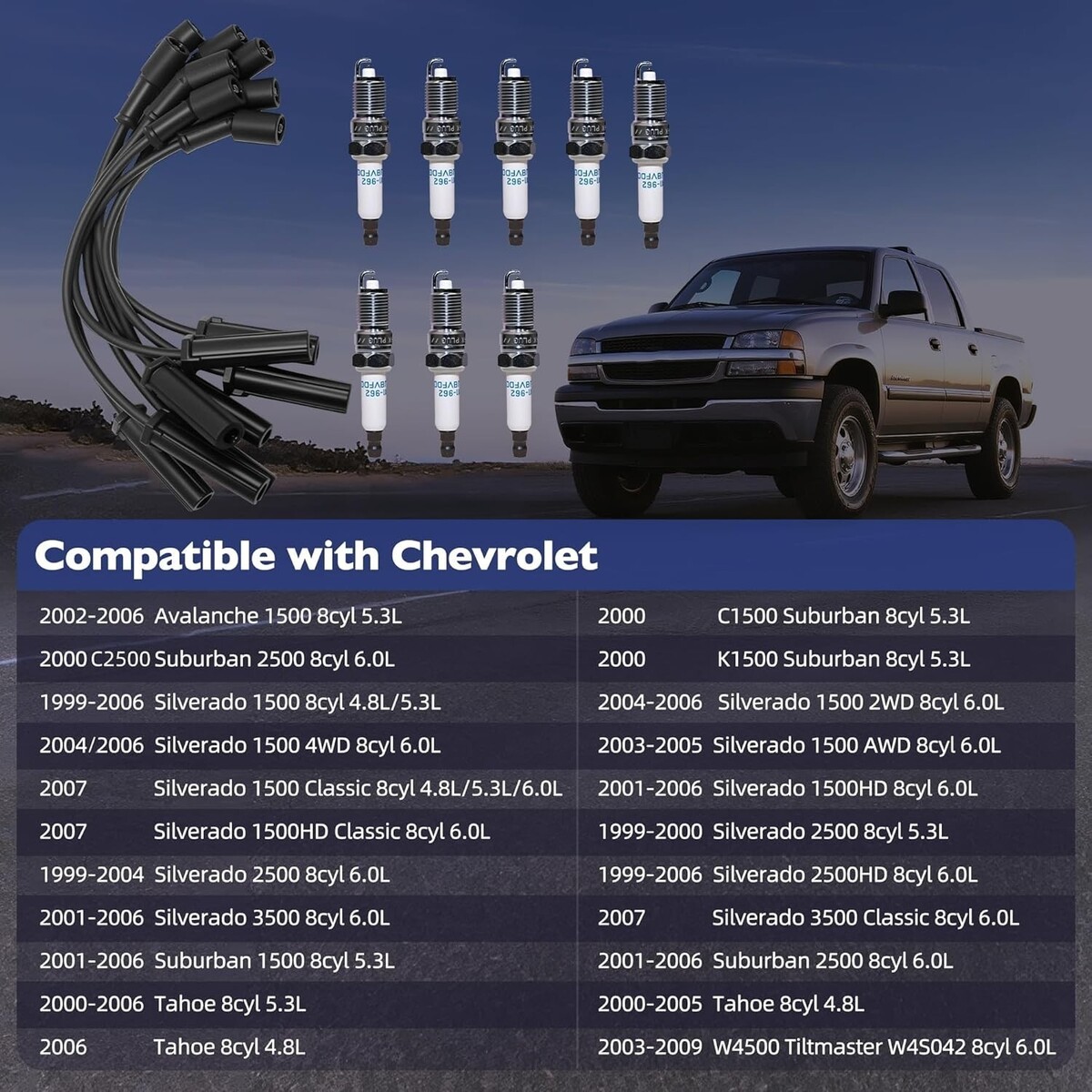 This spark plug wire set is compatible with the 2002-2006 Avalanche 1500, 1999-2006 Silverado 1500, 2007 Silverado 1500 CLASSIC, 1999-2006 Silverado 2500, 2007 Silverado 2500 CLASSIC, 2001-2006 Silverado 3500, 2007 Silverado 3500 CLASSIC, 2000-2006 Suburban 1500, 2000-2006 Suburban 2500, 2000-2006 Tahoe, and 2003-2009 Chevy Trailblazer. It is also compatible with the 2003-2006 HUMMER H2