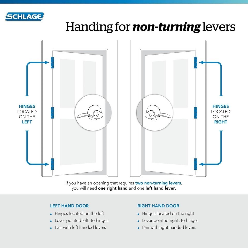 The Schlage F170 ACC 605 LH Accent Lever Half Dummy is designed for residential single- and multi-family homes where decorative hardware is needed on non-functional door sides. Ideal for closet doors, pantries, laundry rooms, and French door pairs, it provides a polished, coordinated appearance when paired with a functional Schlage lock on the opposite door. Its durable build and timeless finish make it a smart choice for homeowners, designers, and contractors seeking reliable, code-compliant, and stylish interior hardware. Easy to install and built to last, it delivers both beauty and function in everyday living spaces.
