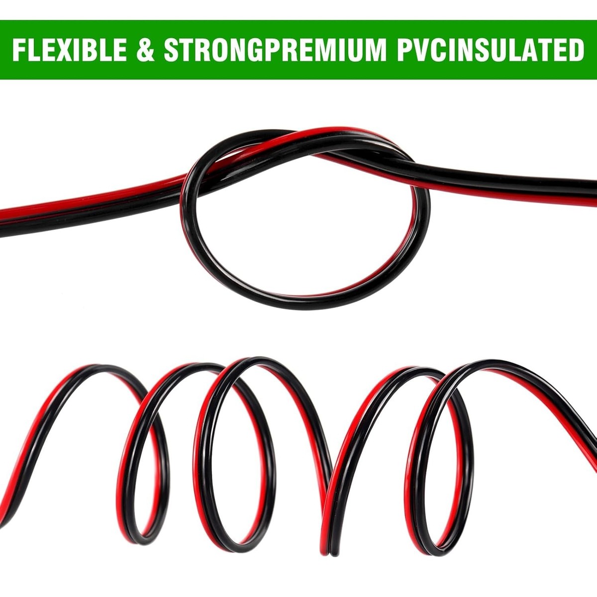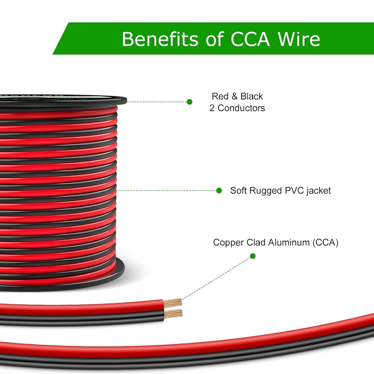 18/2 gauge black and red speaker wire is ideal for low voltage applications such as 12V/24V DC LED monochromatic light strips, electronic appliances and equipment, transformers, led lights, led splitter connections,residential wiring,car circuit,Ship,outdoor spot lights etc.Benefits of CCA Wire : CCA 12 volt wire combines the high conductivity of copper with the lightweight properties of aluminum to provide a lighter, more flexible option. It is more cost-effective than copper wire, saving money while providing the same functionality and reliability as copper wire.