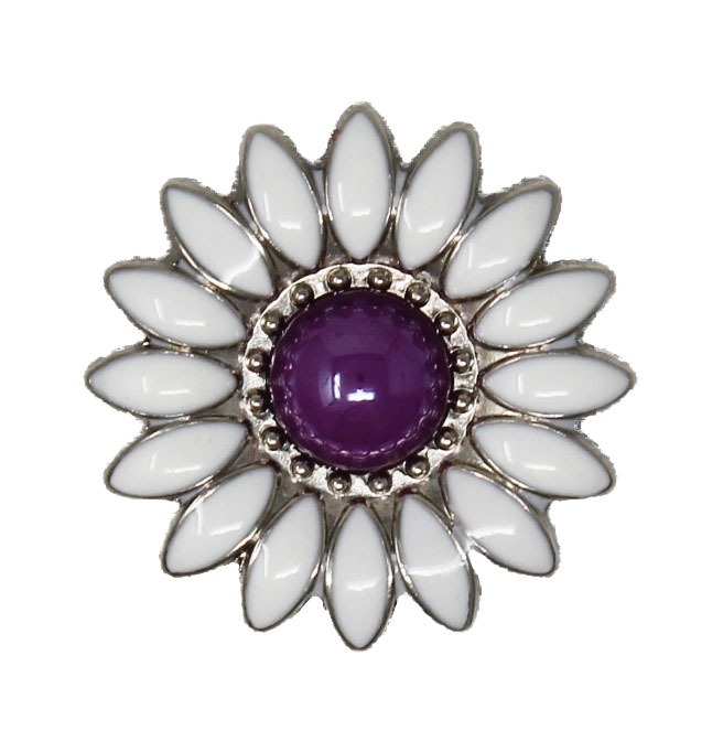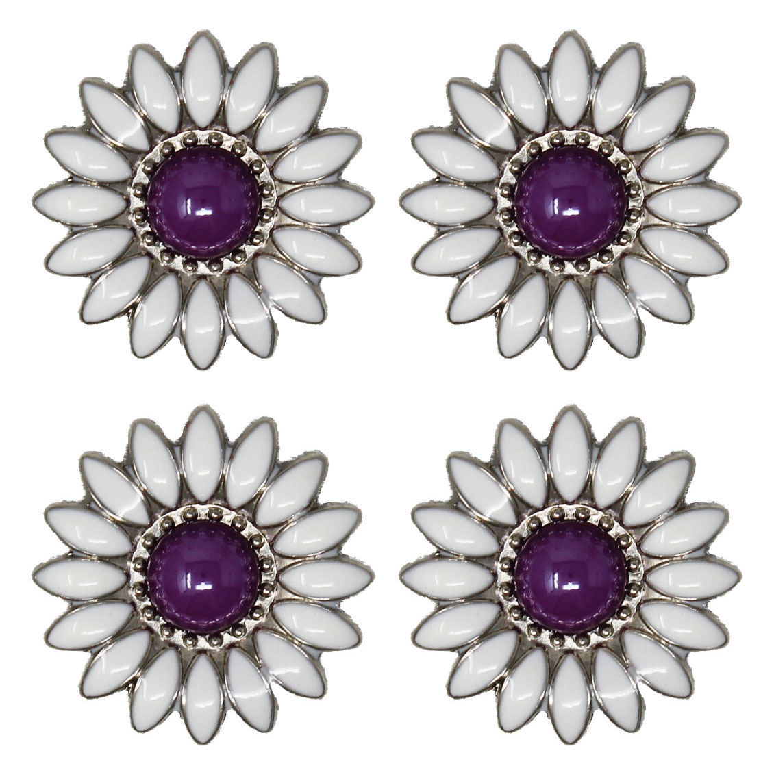 Set of 4 screw back flower conchos with purple stone center. Measures 1-1/4" in diameter. Easy to install with Chicago screws included. Beautifully accents any bridle, saddle, belt, bag, hat, jewelry, etc.