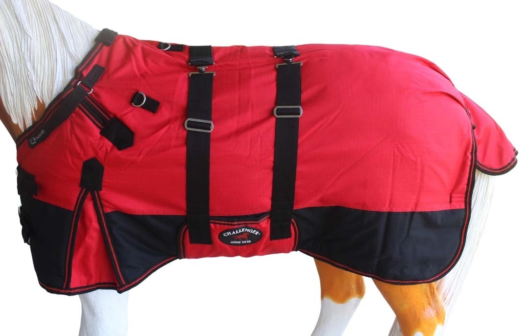 Challenger Foal Medium-Weight Turnout Blanket is waterproof and breathable, allowing your horse to stay comfortable in many weather conditions. Made of 600 Denier heavy duty rip-stop outer for durability, and 250g of Pollyfill providing warmth and wind protection. Blanket features an adjustable double buckle front closure, pull loop adjustable neck, cross surcingles, and elastic leg straps for a snug fit. The reinforced, double-sewn stress points offer additional reinforcement to help prevent tears, while the fleece wither helps provide protection from rubbing. Shoulder gussets allow for freedom of movement and help to prevent shoulder rubbing. Tail cover provides additional protection from moisture. Hardware made of rust-free stainless steel.