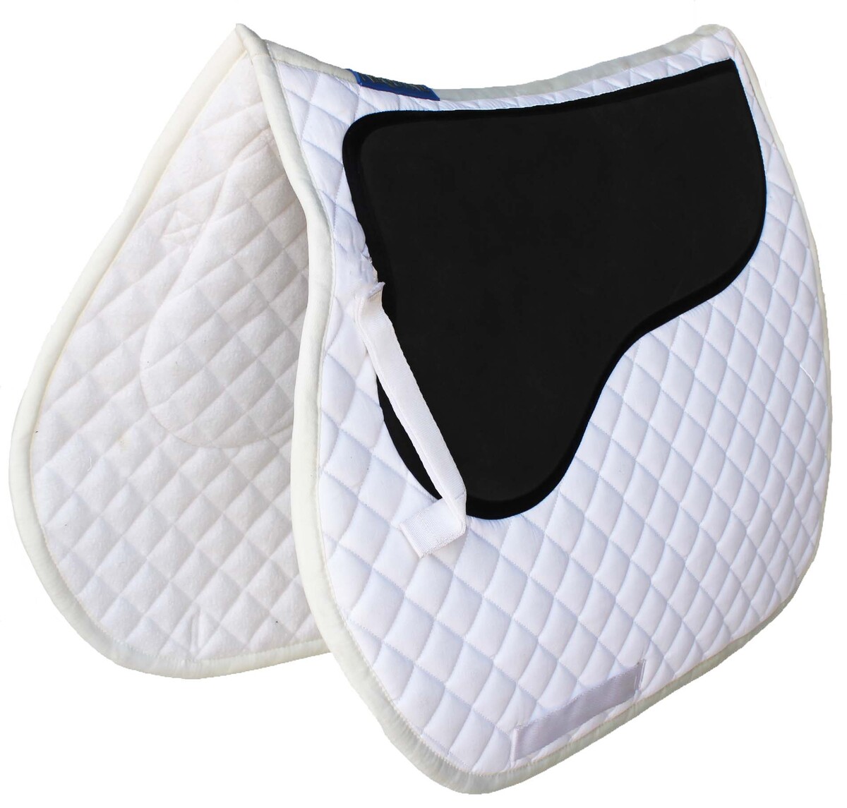 Challenger classic all-purpose English contoured wither relief cut pad with a moisture wicking heavy duty cotton twill quilted fabric. Features a shock absorbing gel, and a soft cotton underside for comfort. Durable Velcro billet keepers and girth loops to prevent tack from shifting. Available in a variety of colors to match your tack! Measures 23" on the spine and has a 21" drop.