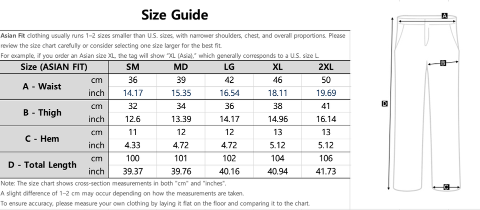 Asian Fit refers to clothing tailored for body shapes commonly found in Asian populations. These items typically run 1-2 sizes smaller than U.S. sizes, with narrower shoulders, chest, and overall proportions. Please check the size chart carefully or consider sizing up for the best fit.