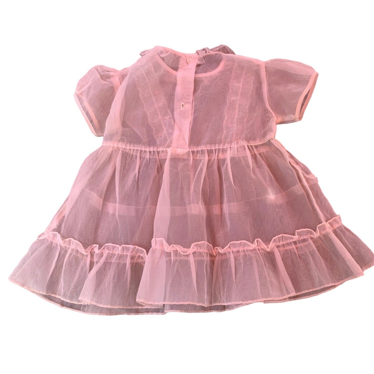 Retro vintage 1950s baby girl party dress in sheer pink nylon with delicate embroidery, styled in the classic ?Daddy?s Girl? look (not labeled as such). Features puff sleeves, fitted waist, and a full skirt perfect for twirling.