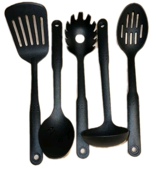 FIVE (5) T-FAL Utensils ~ BLACK ~ Spatula ~ 2-Spoons ~ Pasta Server ~ Ladle