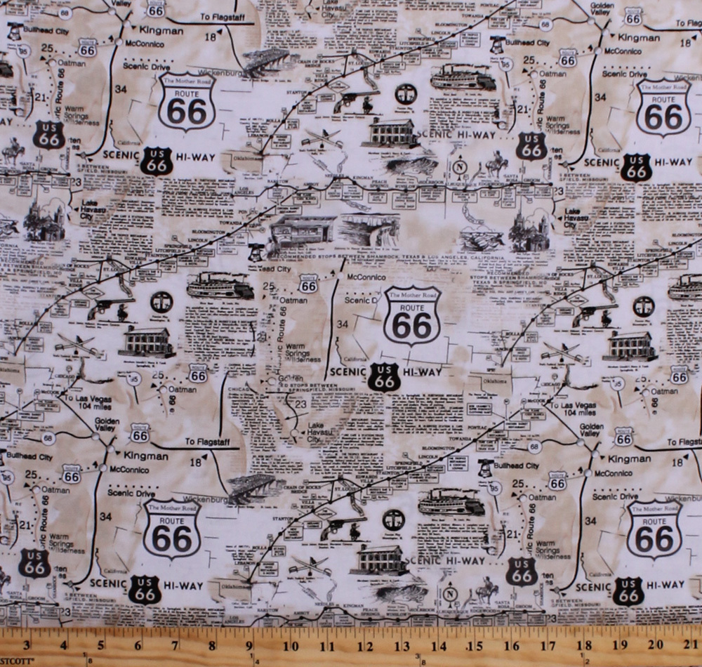 Cotton Vintage Route 66 Map Newspaper Print Travel Fabric Print BTY D578.31