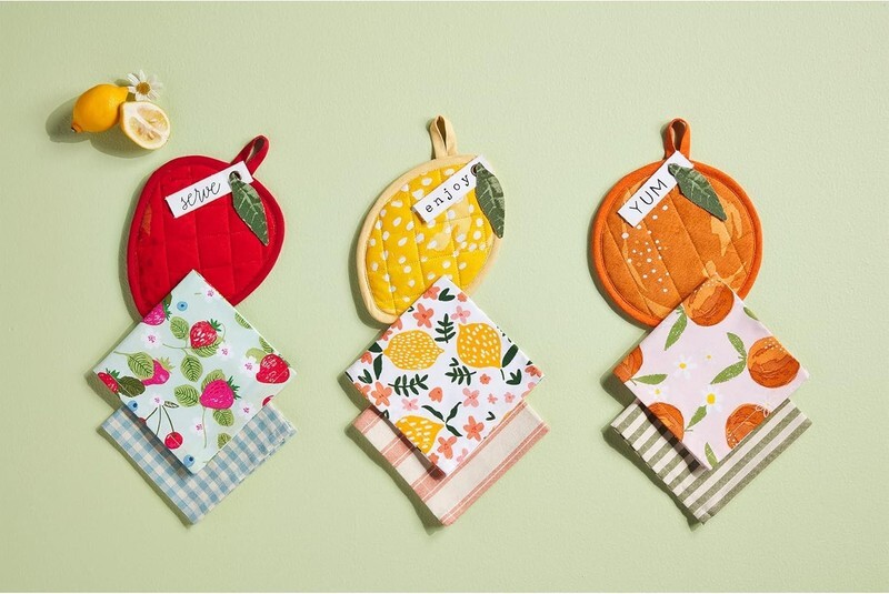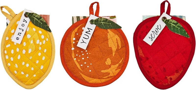 3-piece set. Fruit shaped cotton pot holder comes with two cotton hand towels.
