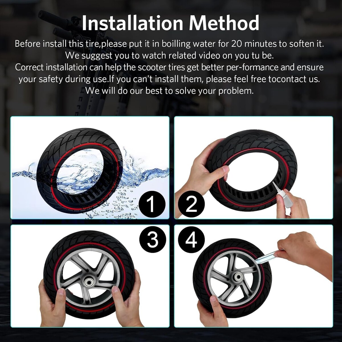 ??Installation method? Before install this tire,please put it in boiling water for 15 minutes to soften it. We recommend that you watch related installation videos on youtube first.Correct installation can help our scooter tires get better performance and ensure your safety during use.