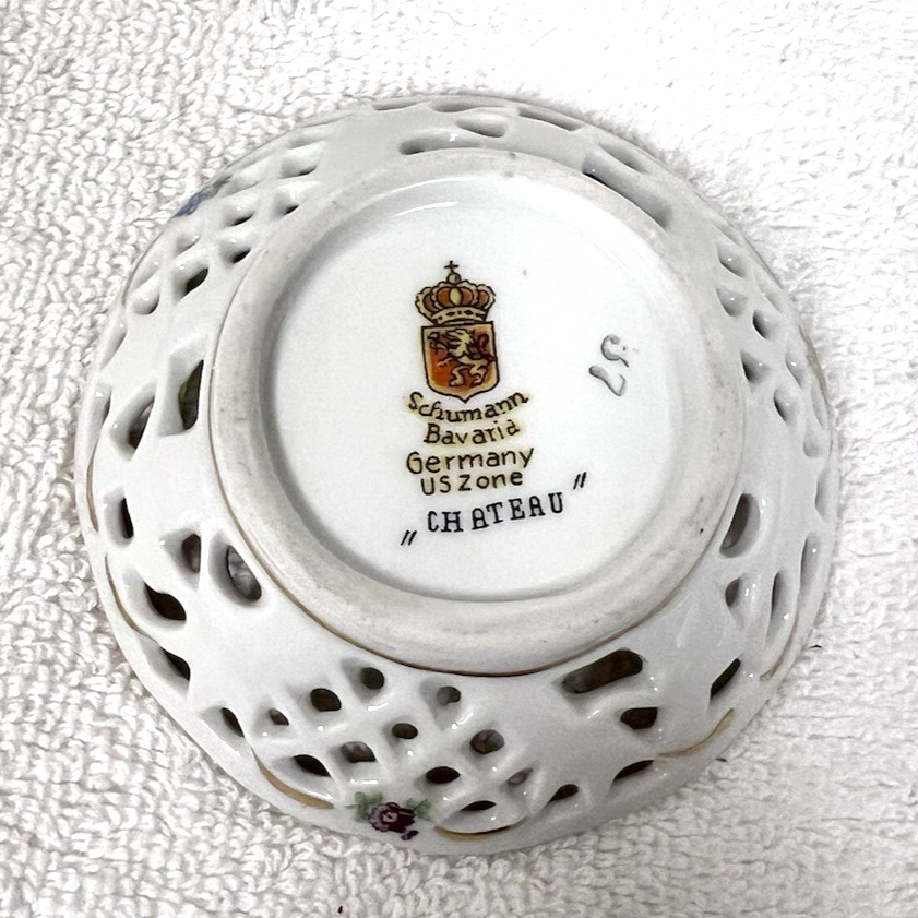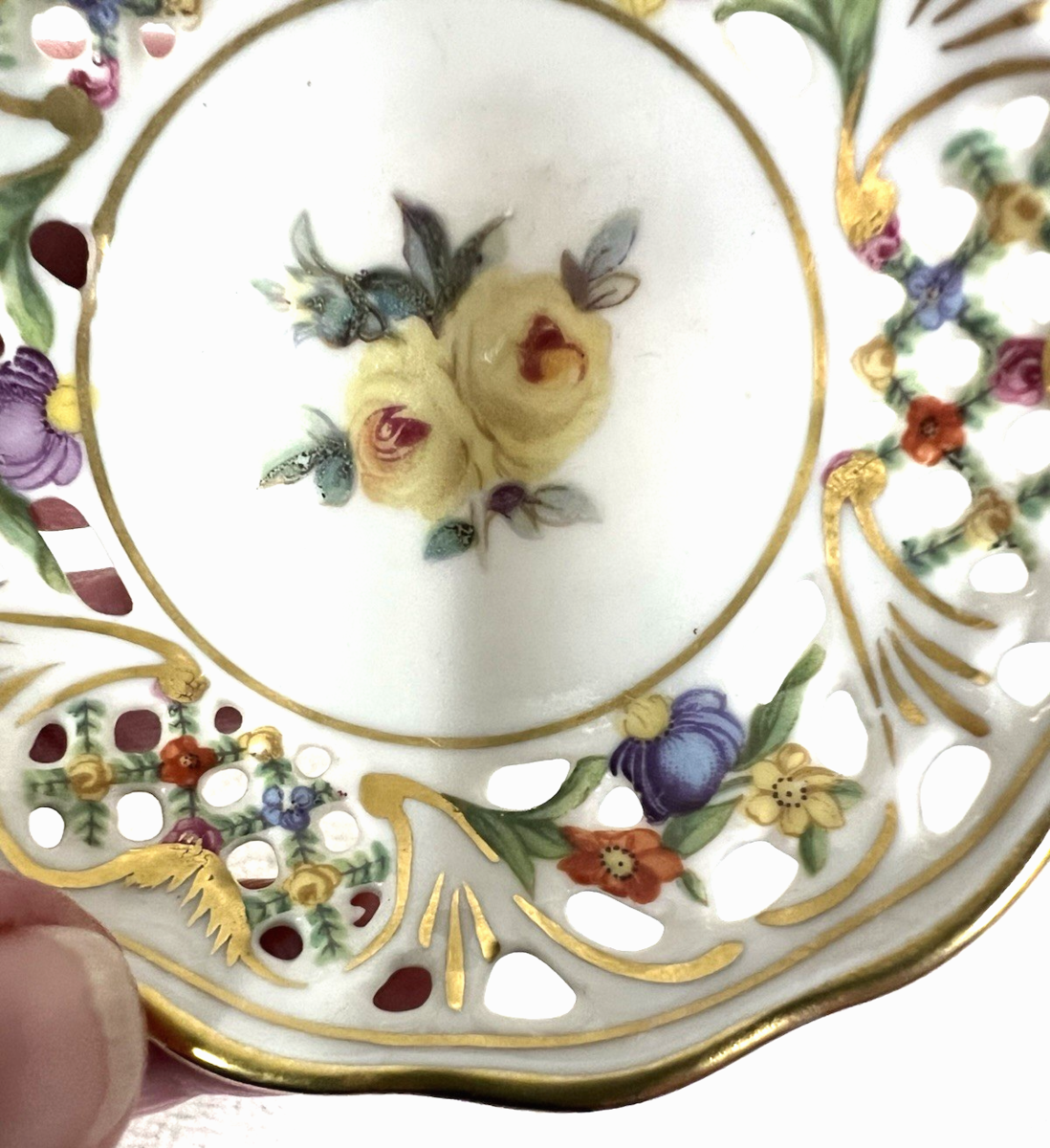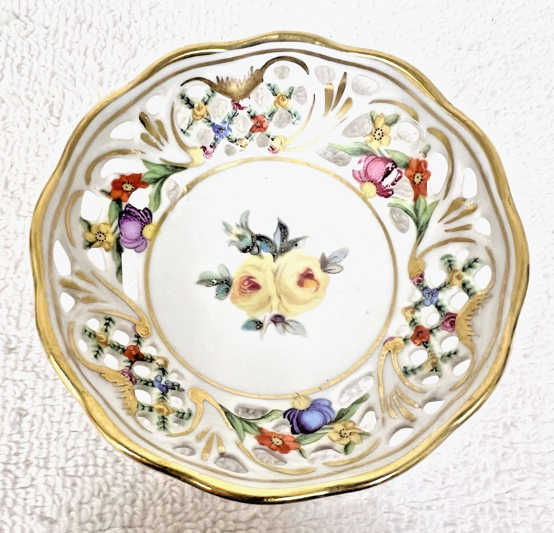Chateau Dresden Royal Dresner Art Nut Dish 3" Pierced Round Yellow Rose Center In great shape I do want you to note the pink flower inside has a color gap, but it is how it was made