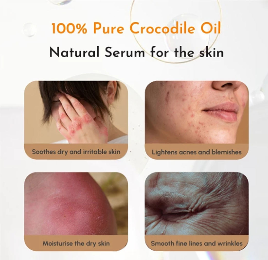 Crocodile oil is a natural substance extracted from selected fatty tissues of crocodiles. It has been used for many years by different cultures as a treatment for different ailments, and as a miracle cure for skin problems such as acne and pimples, burns, wounds, sunburns, bleeding and the most severe cases of eczema.
