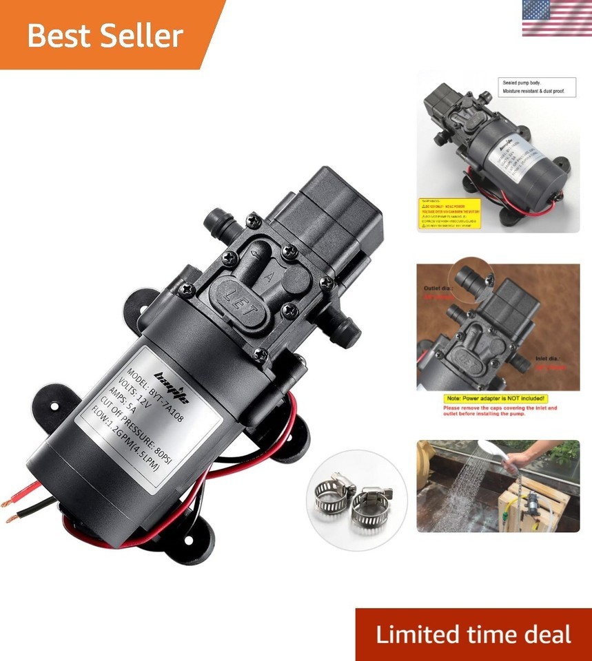12V DC Water Transfer Pump with 2 Hose Clamps 12 Volt Diaphragm Pump Self Priming Sprayer Pump with Pressure Switch L/Min GPM 80 PSI Adjustable for Weed ATV Marine Boat