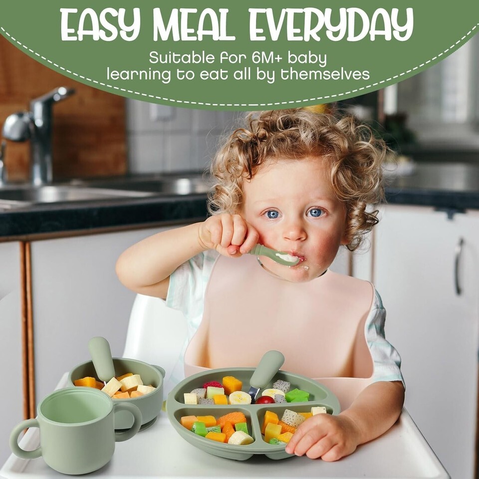 Divided Suction Design: the bowls and plates in this baby feeding set are designed with a suction design, effectively avoiding the plates and bowls from slipping on the table, thus playing a good anti slip effect, which can better reduce mess and keep your little baby more independent at mealtimes
