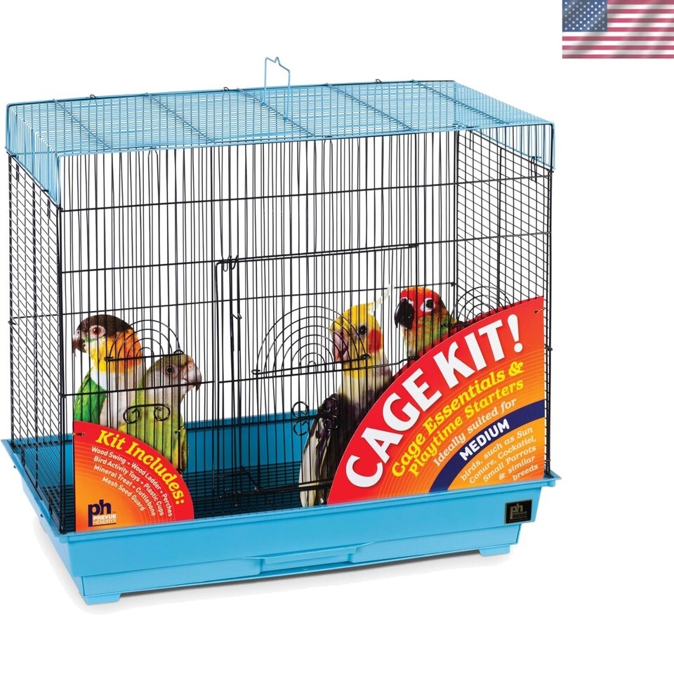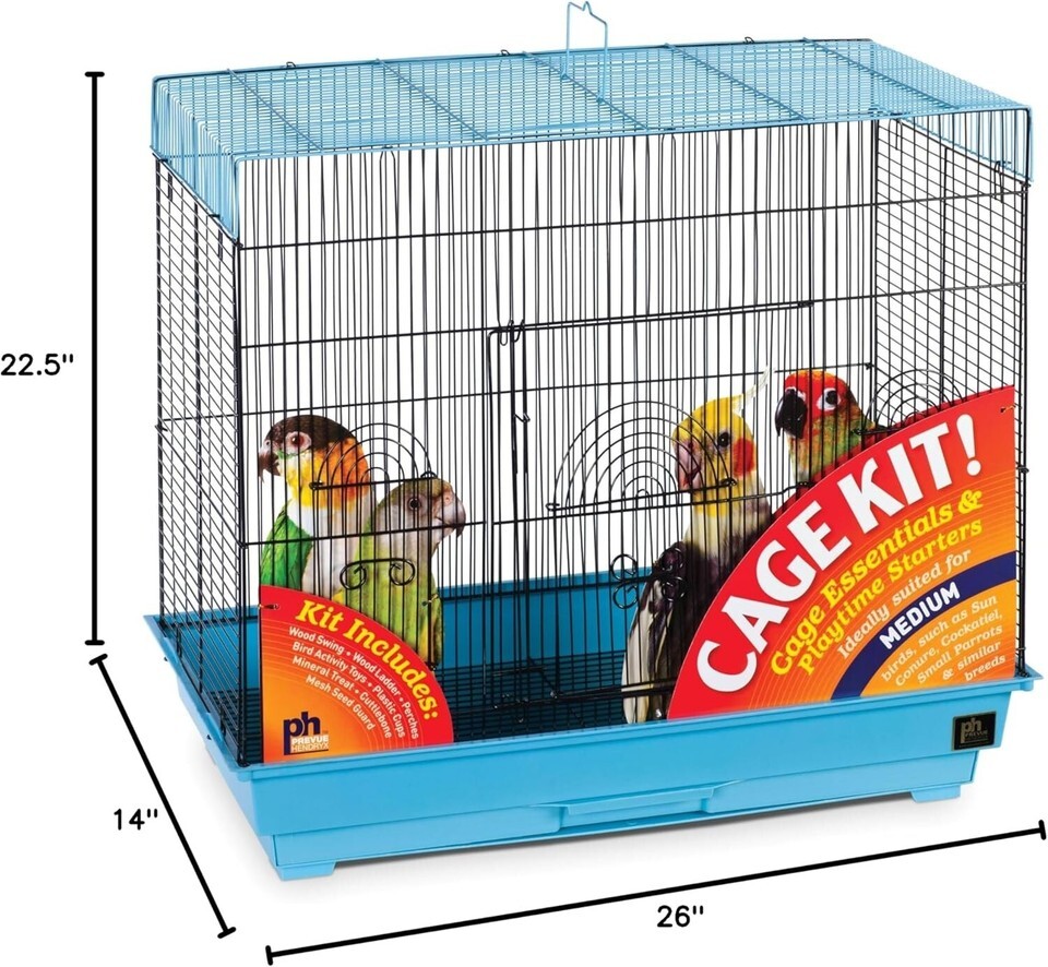 Prevue Pet Products Flight Bird Cage Kit contains everything you need to keep your bird safe and entertained. Our Flight Cage Kit includes two hooded plastic cups, two wood perches, one cuttlebone, one solid wood ladder, one mineral treat and a variety of toys. Measures 26-inch long, 14-inch wide, 22-1/2-inch high with 1/2-inch wire spacing, designed for small to medium sized birds. Made in the USA.
