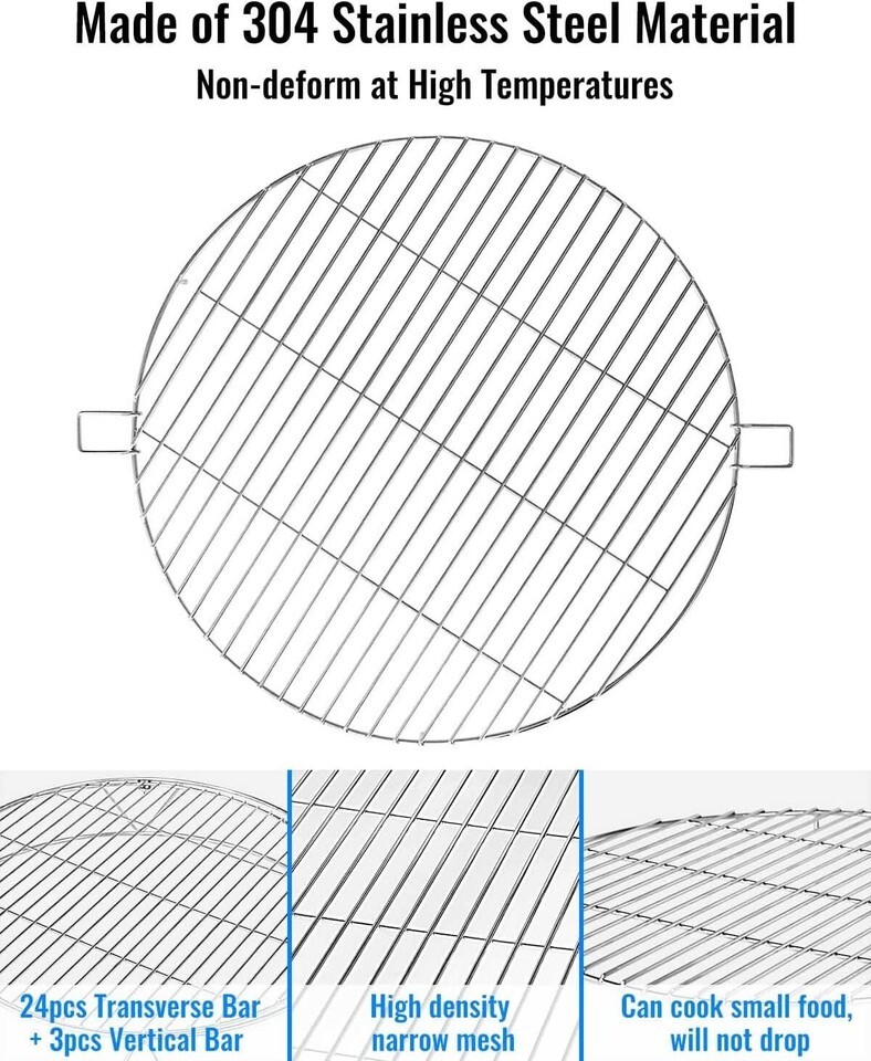 304 Stainless Steel Material: High quality stainless steel cooking grates stand kit, corrosion resistance, heat resistance, long time use is not easy to deformation, colorfast, more reliable, and makes it incredibly easy to clean and maintain
