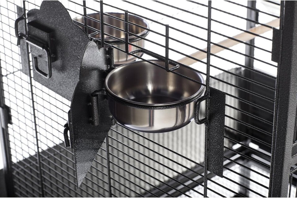 Park Plaza Bird Cage Coco Brown offers quality craftsmanship at an affordable cost. Constructed of durable wrought iron, this cage is designed for parakeets, canaries and other small to medium sized birds. Cage includes one solid wood perch, two stainless steel cups and an easy rolling stand with casters. Pull out grille and debris tray make this cage easy to clean while the rounded corner seed guards and solid-panel cup doors control debris outside the cage. A heavy duty lock plus additional windbell securely fast the large front door. Our Park Plaza cage in Coco Brown measures 24 long, 20 wide and 52 3/4 high with oe wire spacing.