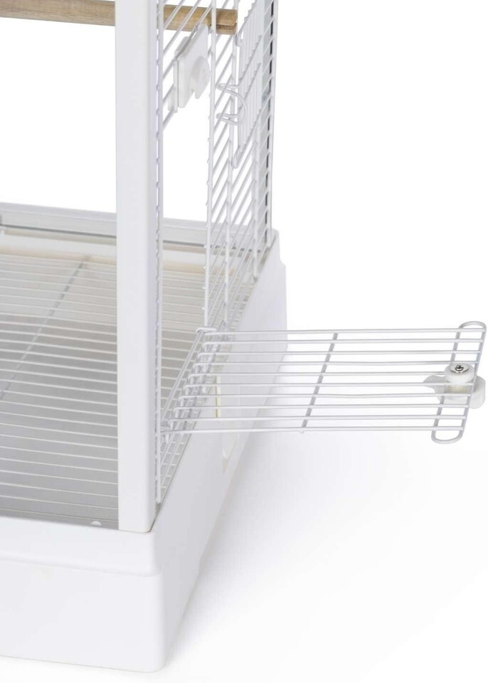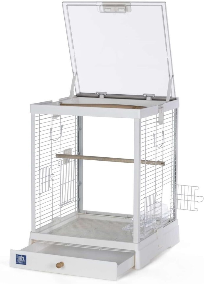 Bird-watch with unobstructed delight! The modern, elegant Crystal Palace glass-sided cage from Pet Products allows for see-through visibility and a clear view of your precious feathered friends. The frosted-acrylic roof opens fully for full-cage access, and can be propped open to let birds come and go as they please. The rooftop also features a perch ? an ideal hangout for birds or for hanging toys. The rooftop and the cage-body mesh all snap-on, snap-off with ease to keep cleaning an easy, routine task. Available in black or white, the Crystal Palace includes: two wood dowel perches; two food/water cups; and a pull-out grille and debris tray for easy cleaning, and the side panel features food/water cup doors and a landing-style access door. Includes convenient carrying handles.