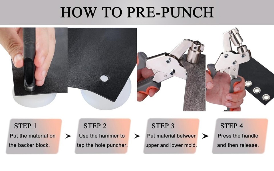 ?Portable Flexible use?This grommet tool kit characterizes a special lightweight design, it is flexible for all angles of use. With a returning spring inside, automatic return after pressing and suitable for indoor or outdoor set-up, repair, and decorating works, etc.