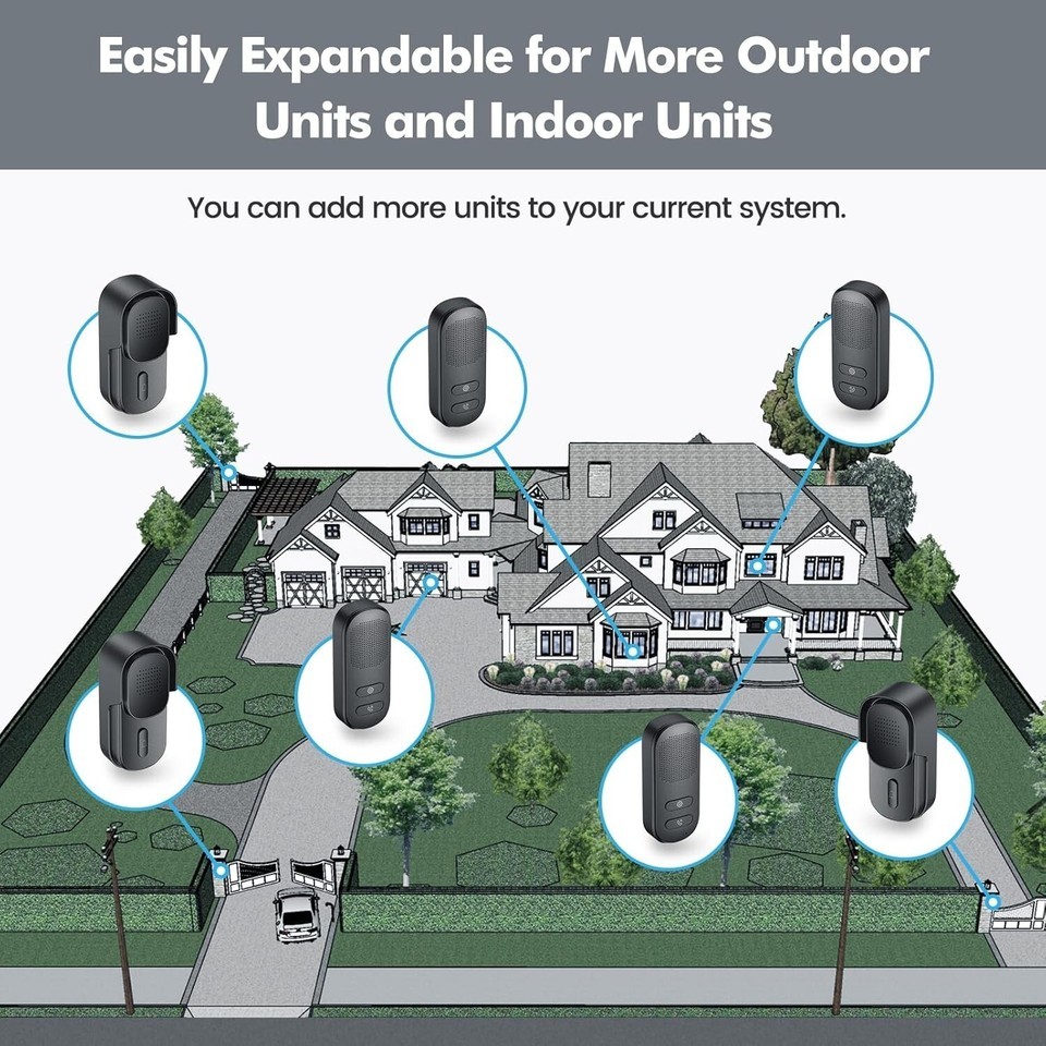 [Long Range Expandable] This wireless doorbell chime transmits up to 1/2 Mile in an open area! The wireless intercom doorbell is expandable up to 2 outdoor units and 5 indoor units. All doorbell sets are paired in the factory; you do not need to pair units if you buy the set. Just charge it and use it.